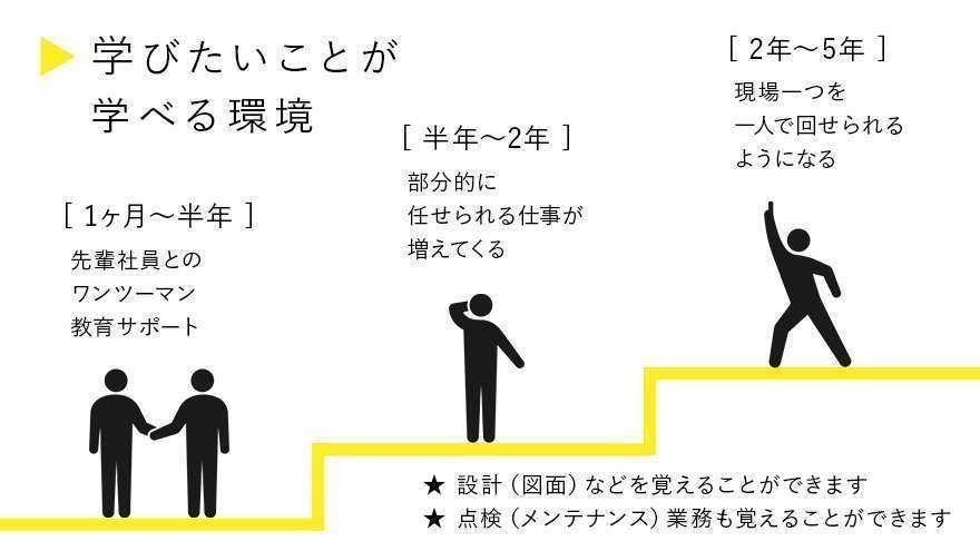 電気工事2種以上、消防設備士など、業界での経験をなにかしらお持ちの方は、優遇させていただきます。その力をぜひ私たちにお貸しください。個々の能力を最大限活かせるよう、会社も全力でバックアップいたします。さまざまな挑戦のできる会社ですので、より成長したい方には最適な環境です。
